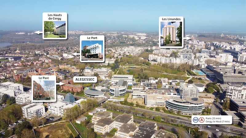 À Cergy-Pontoise, l’ESSEC vous propose quatre résidences étudiantes pour profiter de tous les avantages de la vie du campus dans un environnement international, convivial et dynamique. L’ALEGESSEC (Association pour le Logement des Étudiants du Groupe ESSEC) loge un étudiant de l’école sur quatre et plus de 84 % d’étudiants internationaux.